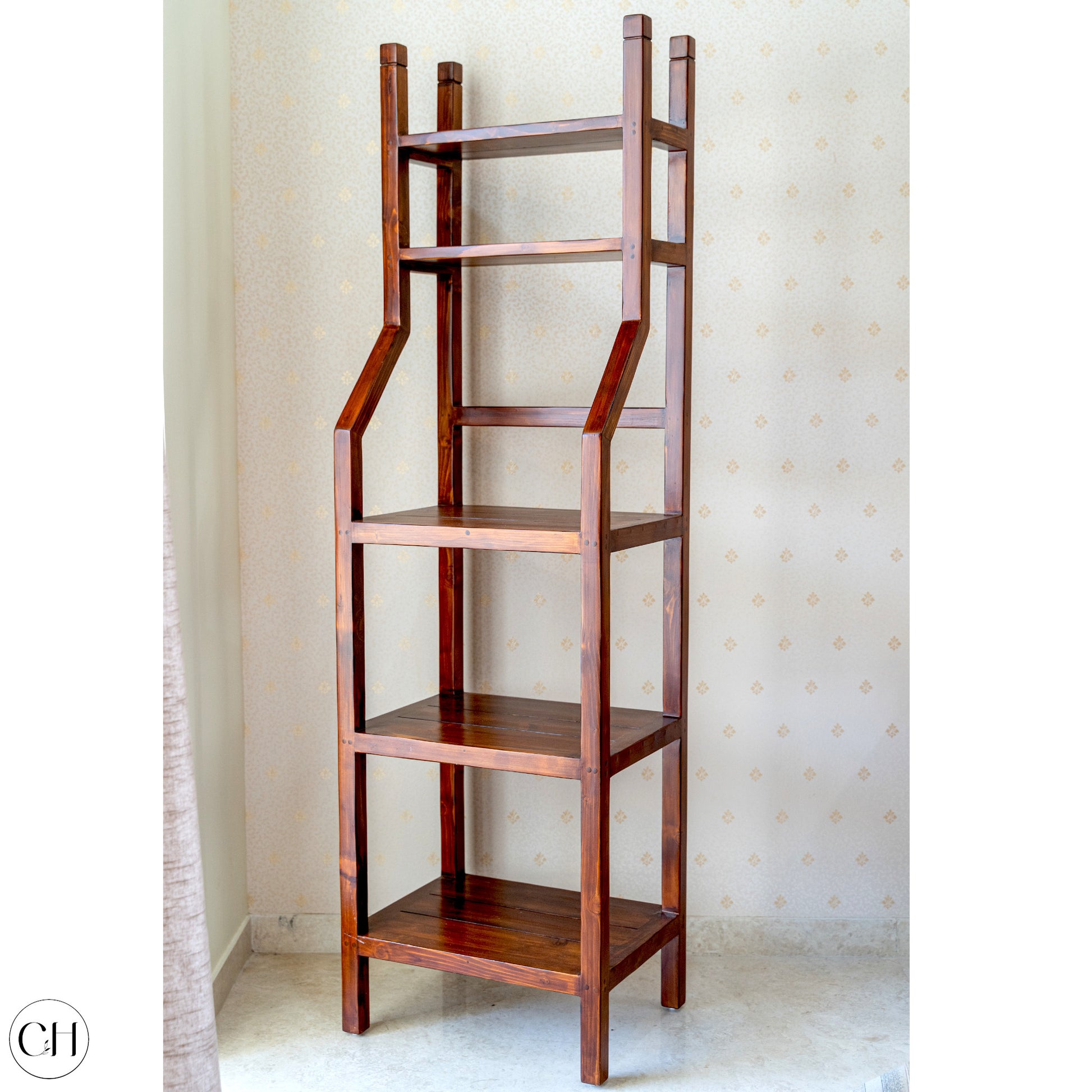 Meet Zeenat, our version of the French etagere shelf. This handcrafted 5-tiered wooden open shelf is an elegant piece of furniture characterized by its open, tiered shelving design. Inspired by the French design (etagere = French for "level"), this beautiful unit features multiple shelves arranged at varying heights and is perfect for displaying your cherished decorative objects, plants, books, etc.. This etagere shelf serves both functional and aesthetic purpose, providing a stylish storage solution while adding visual interest to interior spaces.